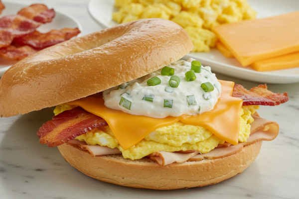 Turkey bacon, scrambled eggs, cheddar cheese, and scallion cream cheese.