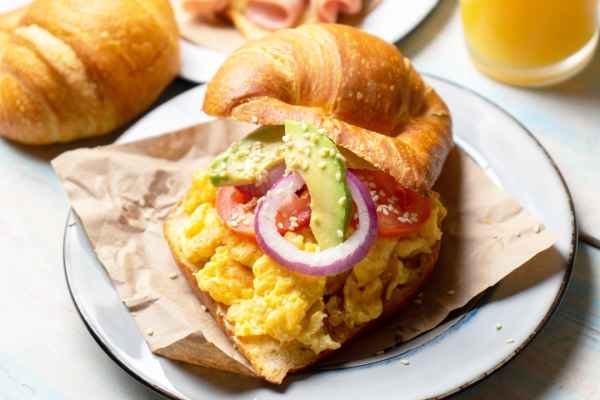 A soft, buttery croissant encases scrambled eggs, creamy avocado slices, and melted cheese, creating a harmonious flavor blend.